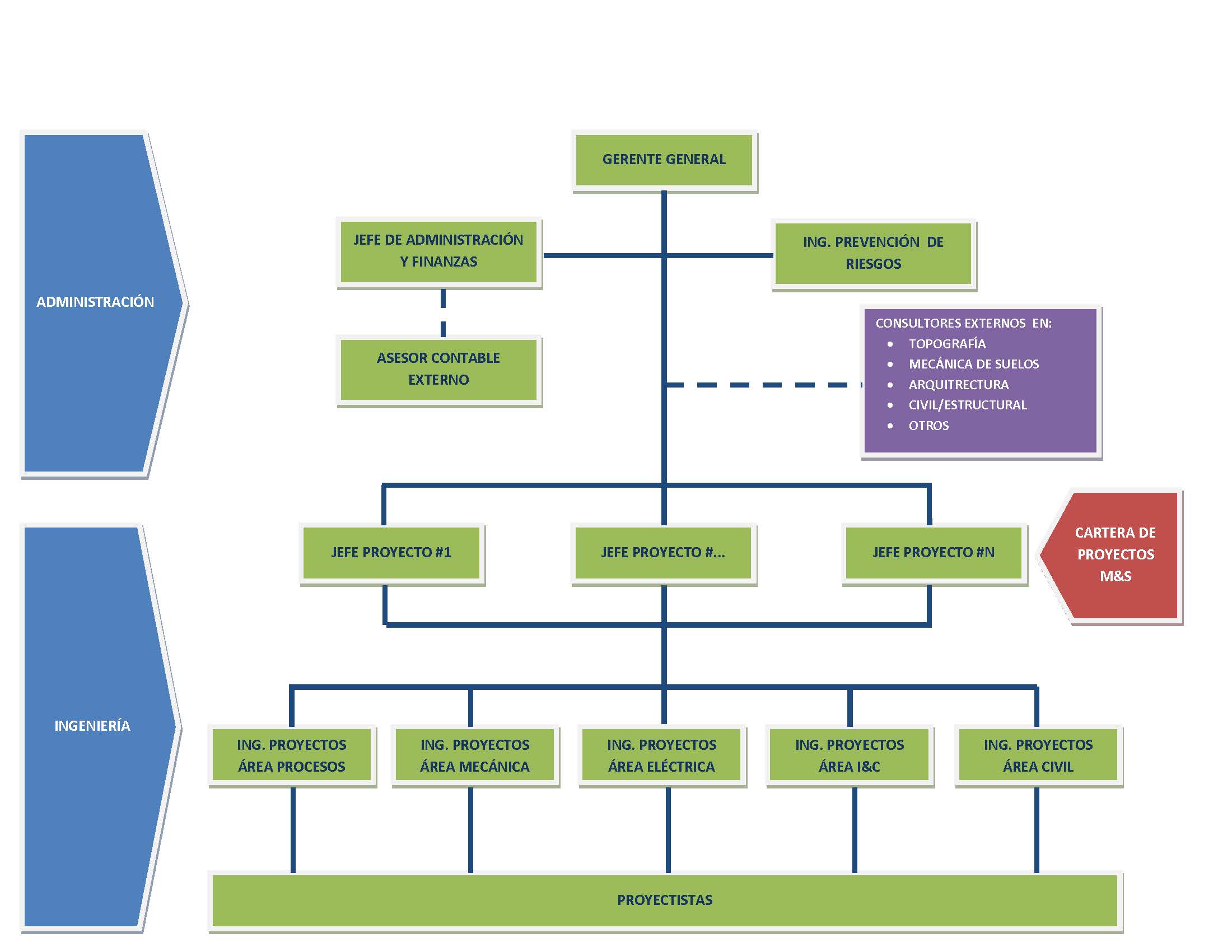 Con el pasar de los años, ya es una empresa con una dotación estable de 16 personas, entre ingenieros, proyectistas y administrativos, cuya estructura es la siguiente: